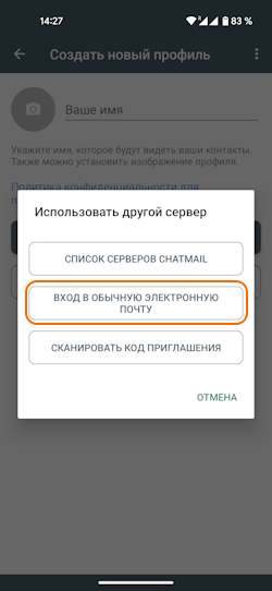 Создать новый профиль -> Использовать другой сервер -> Вход в обычную электронную почту