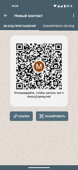 Чтобы пригласить в чат, можно использовать QR код. Так как приложение работает через почту, то Вы можете отправить письмо прямо из него и выглядеть это будет у Вас как чат, а тот кто его получит как письмо. Чтобы отображение было в виде чата, просто отправьте собеседнику ссылку на приложение или на данную статью.