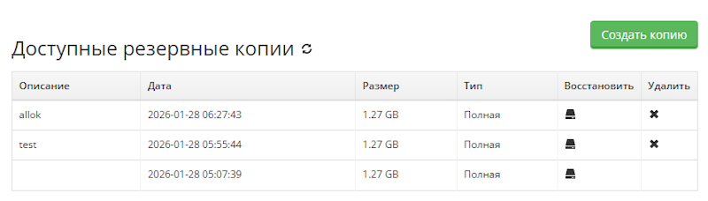 Наша платформа ежемесячно создает резервные копии для всех серверов, после чего они становятся доступны в личном кабинете с возможностью восстановления клиентом. Если Вам нужно сделать собственную копию Вы можете ее создать в личном кабинете.